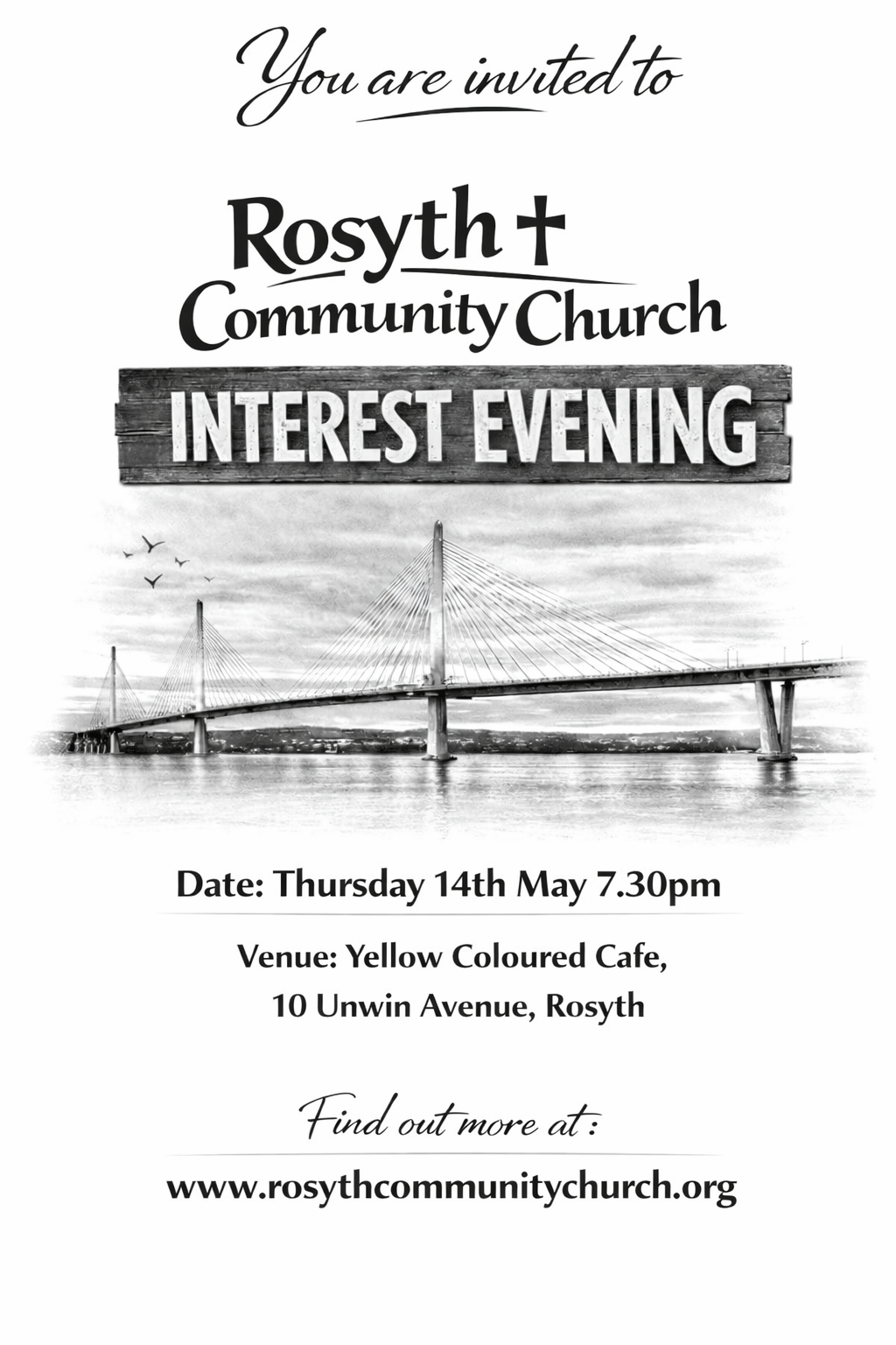 You are invited to the Rosyth Community Church Interest Evening on Thursday 14th May at 7.30pm. All welcome See below.